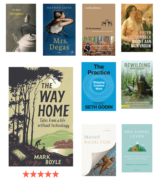 Zo’n leven dichter bij de natuur beschrijft ook Mark Boyle, in zijn boek The Way Home – Tales from a life without technology. Een prachtig, eerlijk en eenvoudig verslag van een leven zonder (moderne) technologie, in een zelfgebouwde hut in Ierland. Boyle is daar samen met zijn vriendin gaan wonen, nadat hij zich helemaal heeft losgemaakt van het ‘gewone’ leven waarin technologie zo’n grote rol speelt. Dus geen internet, geen email, geen laptop, telefoon of zelfs maar een typemachine. Ook geen elektriciteit en stromend water. Ze leven van wat ze verbouwen in de moestuin, en wat het bos oplevert aan eetbare planten en dieren. Ze wonen echter niet in totale isolatie, want ze hebben buren, en het nabijgelegen dorp heeft een pub waar ze vrienden ontmoeten. Een boek dat aan het denken zet en inspireert tot een andere manier van leven.