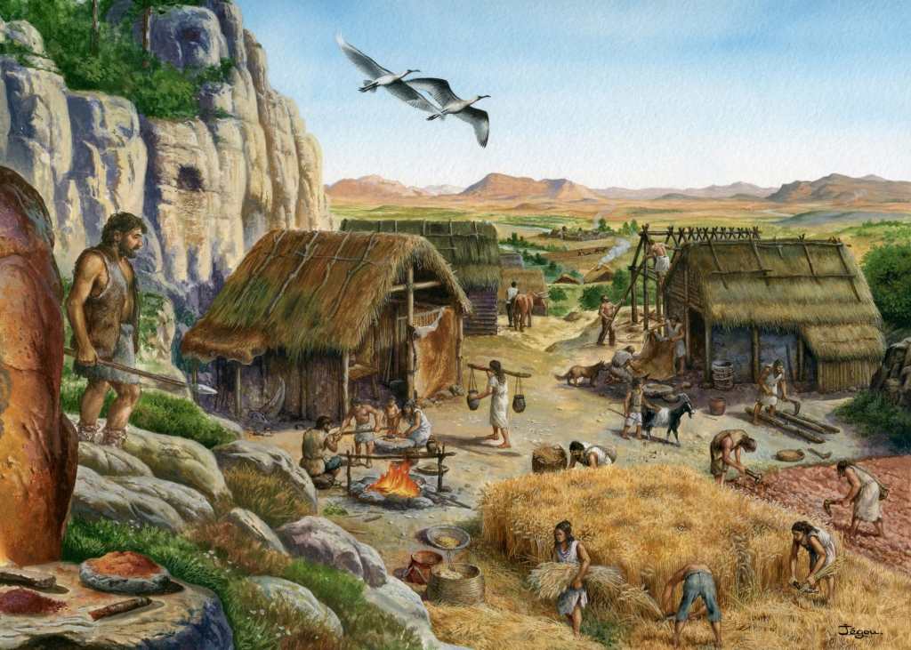 De domesticatie van de mens hangt samen met de opkomst van de landbouw, en specifiek met de domesticatie van tarwe en andere granen. Om deze granen te kunnen verbouwen, was het nodig dat mensen op één plek bleven, in plaats van als nomaden rond te trekken. Dat bracht een andere omgang met de natuurlijke omgeving met zich mee. De mens paste zich niet langer aan aan de omgeving, maar veranderde de omgeving ten behoeve van de mens. ‘Wild’ landschap werd landbouwgrond en er werden huizen gebouwd om in te wonen. Haines noemt dit de ‘geconstrueerde omgeving’. Dit resulteerde in een minder divers voedingspatroon en een meer sedentaire levensstijl. In plaats van dagelijks lange afstanden lopend af te leggen, speelde het leven zich steeds meer af rond het huis en de akker.