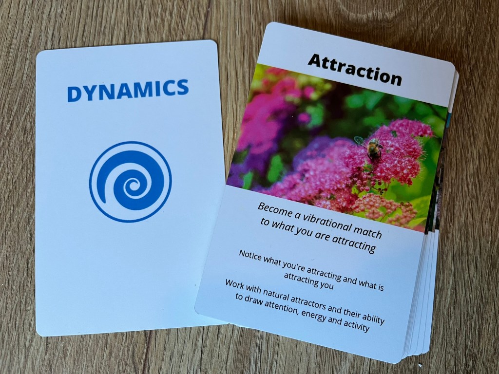 De kaarten zijn onderverdeeld in drie sets: being, dynamics en doing. [Een Nederlandse vertaling is in de maak, maar zolang die er nog niet is gebruik ik maar even de Engelse termen.] Om met de dynamics kaarten te beginnen: hierop zijn processen uit de natuur verbeeld en beschreven, die je ook kunt herkennen en toepassen in je eigen leven of in organisaties. Bijvoorbeeld Interdependence, Potential, Growth en Impermanence. Met deze kaarten deden we in het park bij de Tolhuistuin in Amsterdam een oefening. Iedereen koos een dynamics kaart en ging vervolgens op zoek naar voorbeelden van het begrip op de kaart. Zoals dood blad op de grond voor Impermanence, of een bij die een bloem bezoekt voor Interdependence. Vervolgens kun je bij jezelf nagaan in hoeverre je deze dynamiek ook herkent in je eigen leven en dit tenslotte met elkaar delen. Een eenvoudige oefening die je al meteen heel anders naar je omgeving en jezelf laat kijken.