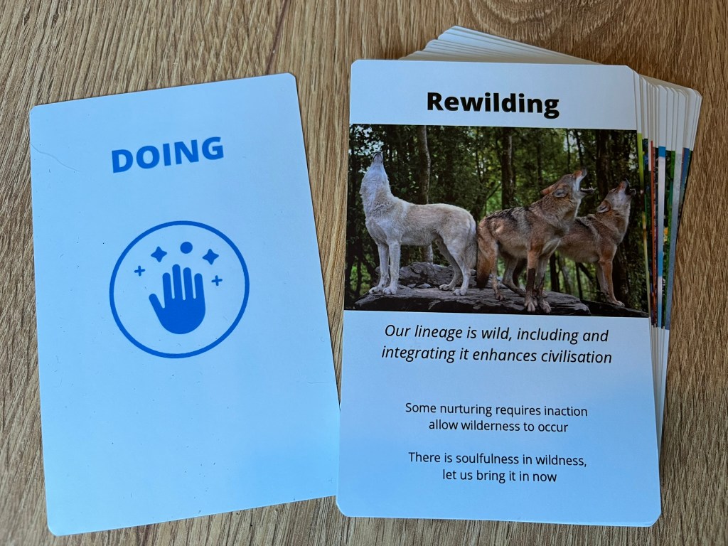 De workshop werd gegeven door Marieke Smets en Monique Wisse van Spark for Life. Het was mijn eerste kennismaking met Cards for Life, een prachtige kaartenset, ontworpen en bedacht door Tom Mansfield van Pale Blue Perspective. De bedoeling van deze kaarten is je te helpen op een andere manier naar de wereld en naar jezelf te gaan kijken. Het is als het ware een uitbreiding van je woordenschat en van je begrippenkader. Je gaat het leven hierdoor meer zien als een samenhang van relaties en processen, en minder als een verzameling objecten. Dit is een regeneratieve visie op het leven, die je onder ander ook terugziet in de permacultuur.